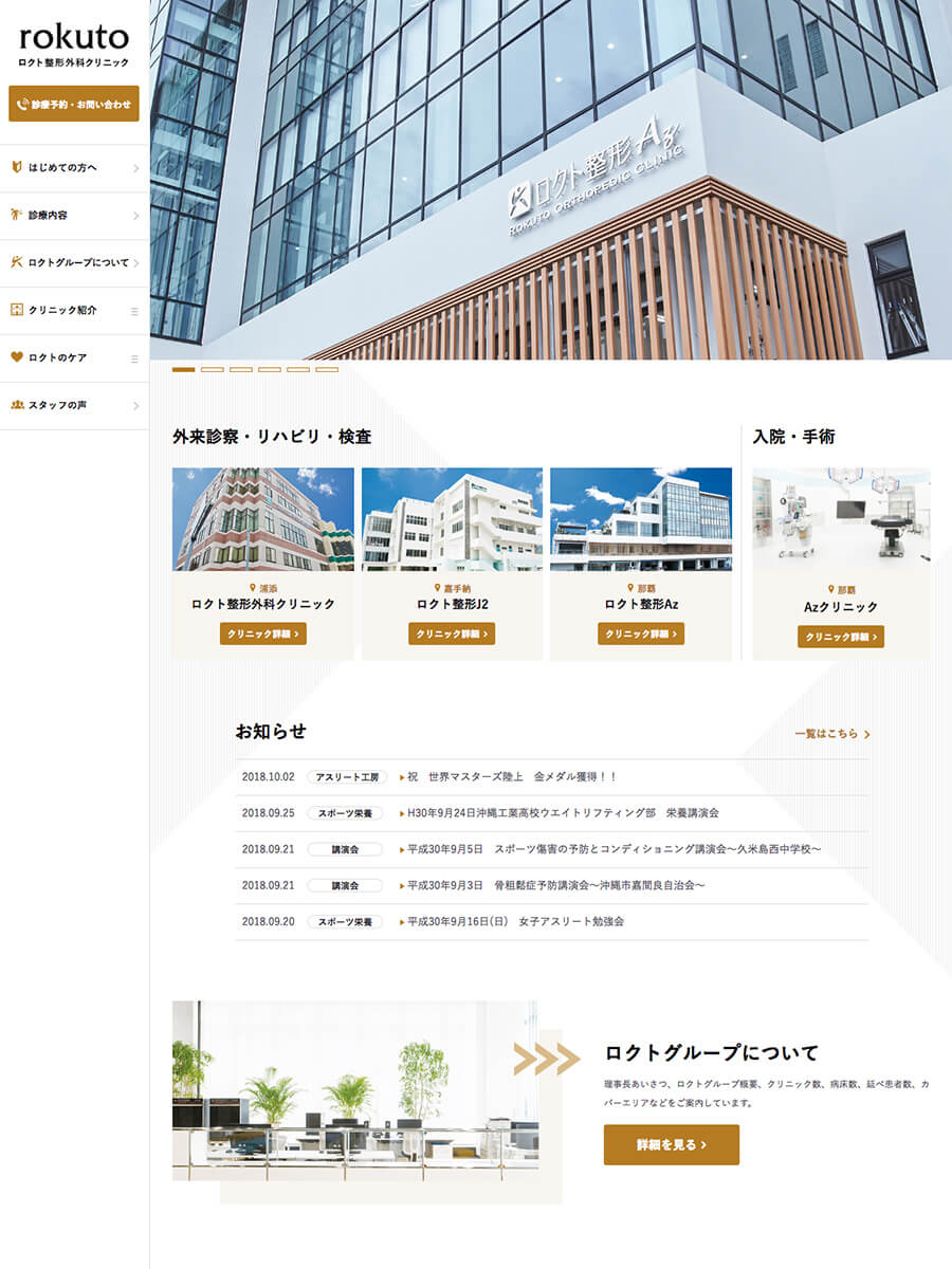 沖縄県内に複数の拠点を構えるロクト整形外科クリニックのコーポレートサイトをフルリニューアルしました。情報の繋がりを意識した導線設計と深い階層でもアクセスしやすいUIの採用により、目的の情報に辿り着くまでの負担軽減を図っています。また、共通化されたコンポーネントを使用して情報発信を容易に行えるよう、CMSの設計・開発を行っています。